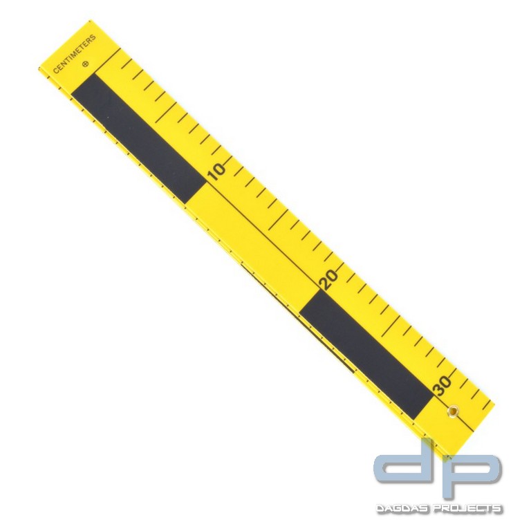 Aufklappbarer Maßstab aus gelbem Kunststoff mit schwarzer Schrift.