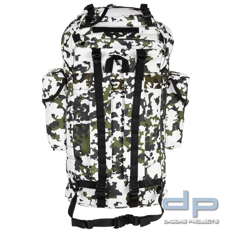 robuster, hochwertiger Kampfrucksackam Deckel vorne kl. Tasche mit Klett, sowie eine aufgesetzte Tasche mit Patte u. Riemenverschlussgroße Deckeltasche mit RV hinten Klettflauschpatch für Name (15x2,5 cm) hinten obenAlu-Aussteifung und gepolsterte RückentragegurteTragegriff2 seitliche Taschen mit Patte & Riemenverschluss flaches Einsteckfach innen für z.B. Iso-MatteHauptfach mit abtrennbaren Bodenfach (Kordelzug)Bodenfach durch RV außen bequem erreichbarPickel- und diverse Befestigungsgurte praktische & robuste Kunststoffschnellverschlüsseca. 65 Liter FassungsvermögenMaße: ca. 63x43x21 cmGewicht: ca. 1400g Material:100% Polyamid
