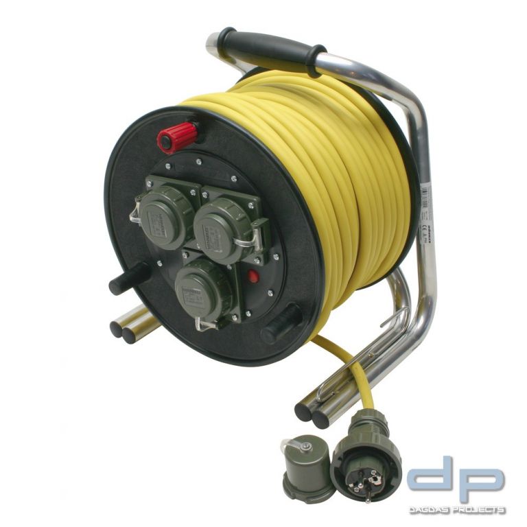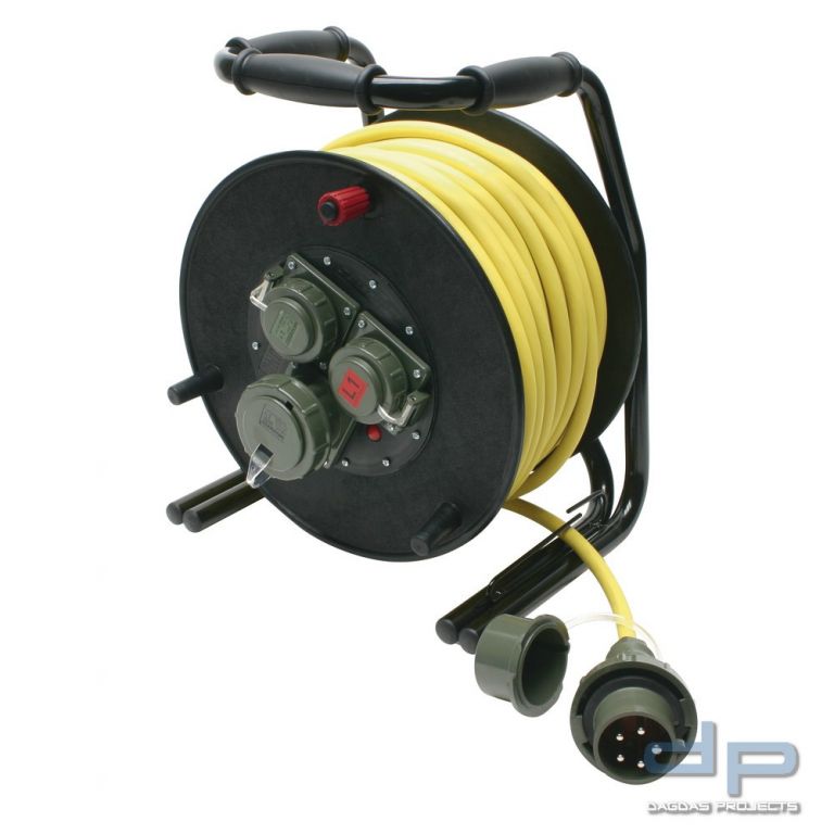 Die drei isolierten ergonomischen Griffe erlauben das bequeme Tragen zu zweit. Das extrem stabile Doppelrohrgestell ist aus Stahlrohr mit 25 mm Durchmesser gefertigt. Der große Kurbelgriff ist abklappbar. Die Absicherung der Dosen befindet sich hinter einem wasserdichten Schutzfenster.Die Trommel ist in den zwei Varianten L1/L2 und L3/L2 lieferbar. Die beiden Schutzkontaktdosen sind unterschiedlich verdrahtet und eindeutig gekennzeichnet, damit auch bei komplexem Aufbau des Versorgungsnetzes eine Schieflast am Generator vermieden werden kannMerkmale:
