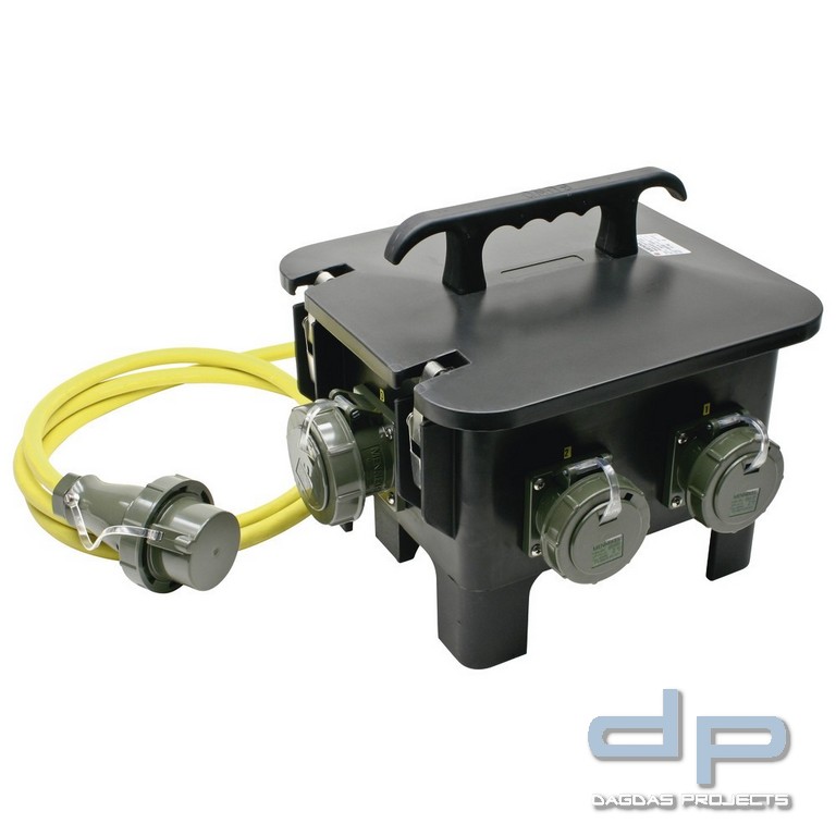 Klassische Form mit Aufhängebügel. Schwarzes Gummikabel H07RN-F5G2.5 nach DIN VDE 0282. Der Verteiler ist komplett wasserdicht IP67.   Anschlusskabel 2 m Eingang 1 x Stecker CEE 5-pol IP67 Ausgang 2 x Kupplung Schuko IP68 Ausgang 2 1 x Kupplung CEE 5-pol IP67 Schutzart IP67 Belastbarkeit 16 A Leitung H07RN-F5G2.5 Gewicht 1.720 g