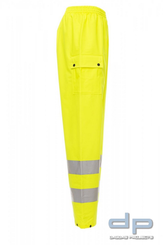 Gut sichtbare Regenhose mit 3M-Streifen, elastischer Taille, zwei seitlichen Blasebalgtaschen mit Knöpfen, Beinabschluss mit Druckknopf zur Weitenregulierung, warmversiegelten Nähten.