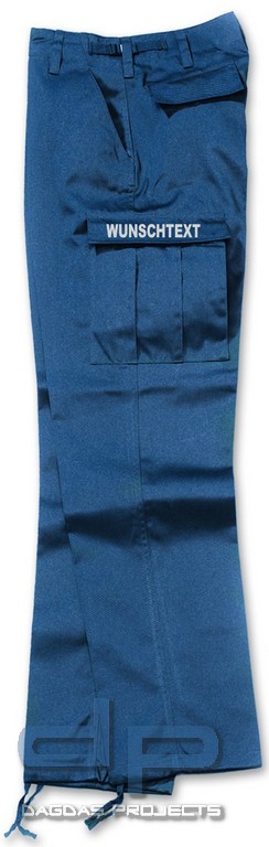 Dunkelblaue Hose mit bedruckten Beintaschen beidseitig Aufdruck in reflektierend silber nach Ihren Wünschen.