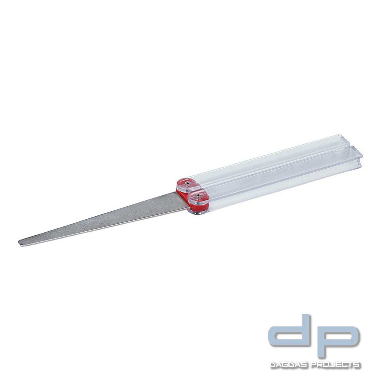 DiaFold Flat File - Der flach geformte DMT Diamantschärfstab ist ein echter Spezialist, wenn es um das Schärfen von Gartenscheren, Scheren und ähnlichen Werkzeugen geht. Aufgrund der flachen, zulaufenden Form eignet sich der Stab auch zum Entgraten an schwer zugänglichen Stellen. Der Farbcode Rot steht bei DMT für die feine 600er Körnung. Für den Einsatz des Schärfstabs wird kein Öl benötigt, denn der Stab kann problemlos mit Wasser oder trocken eingesetzt werden. Die schwenkbaren, transparenten Kunststoffgriffe sorgen in geschlossenem Zustand für den Schutz des Schärfstabs.