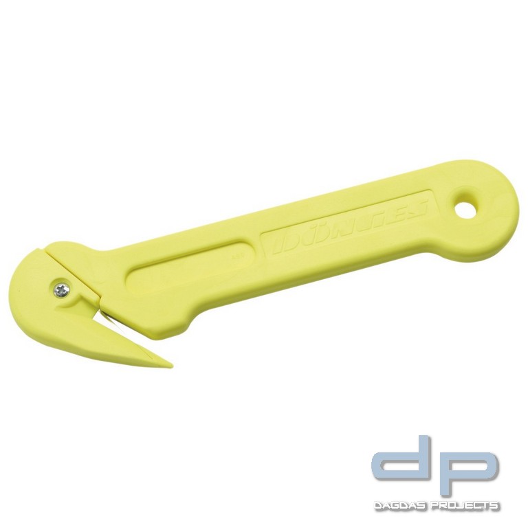 Äußerst robuster Gurttrenner mit verstärktem, neongelbem ABS-Griff und starker, im Messerkörper geschützter Klinge.