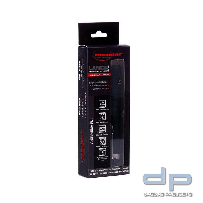 Die PowerTac Lance ist eine AA angetriebene LED-Taschenlampe, die ein superhelles 290 Lumen Licht produziert. Die vielseitige Lampe ist lauffähig mit einer oder zwei AA-Batterien, dadurch verschiedene Leistungsoptionen. Die Lance ist mit einer CREE XP-G2 LED ausgestattet und ist in der Lage einen Lichtstrahl bis zu 141 Meter zu erzeugen mit einer Genauigkeit von knapp 6 "", wird die Lance aus Aero Grade-Aluminium-Legierung mit einer hart eloxierten Oberfläche von militärischer Qualität gefertigt, so dass sie leicht und sehr langlebig ist. Der Körper der Lance ist teilweise gummiert für einen einfachen, komfortablen Halt weil sie IPX-8 wasserdicht ist, ist die Lance geschützt, , im Fall dass sie versehentlich in eine Pfütze fällt oder es anfängt zu regnen. Halten Sie die Lampe in Ihrem Auto, zu Hause oder in der Hosentasche mit Hilfe des mitgelieferten Edelstahl Taschenclips bereit.Merkmale: