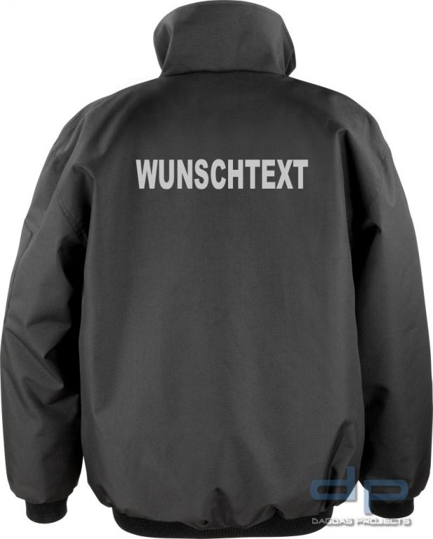 Material ist wind- und wasserdicht,hoch atmungsaktiv durch 3-Lagenlaminat• Aufschrift nach Wunsch vorn und hinten mit reflektierendem Material • alle Reißverschlüsse wasserdicht• Material ist elastisch und hoch abriebfest• angenehm zu tragen durch Fleecematerial innen in derJacke• Reflexmaterial vorne und hinten• Saum und Ärmelsaum weitenverstellbar• KinnschutzTaschen:• Brusttasche rechts• 2 weitere Eingrifftraschen im Brustbereich• 2 seitliche Hüfttaschen• Saum und Ärmelsaum weitenverstellbar• Saum und Ärmelsaum aus Oxford-MaterialBitte Wunschtext in das Textfeld eintragen. Sollten Sie keinen Aufdruck wünschen, dann tragen Sie bitte "ohne Druck" in das Textfeld ein!Farbe der Jacke: Schwarz